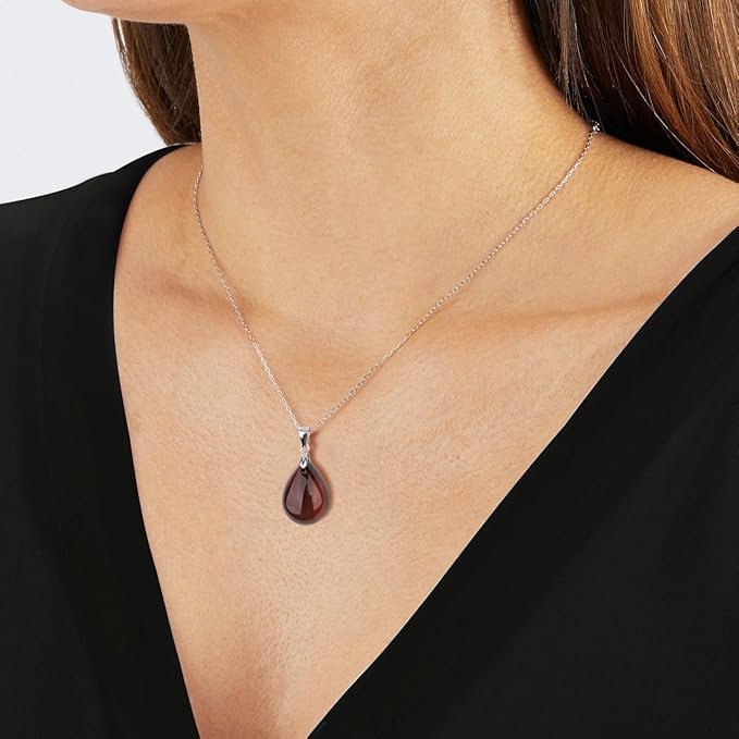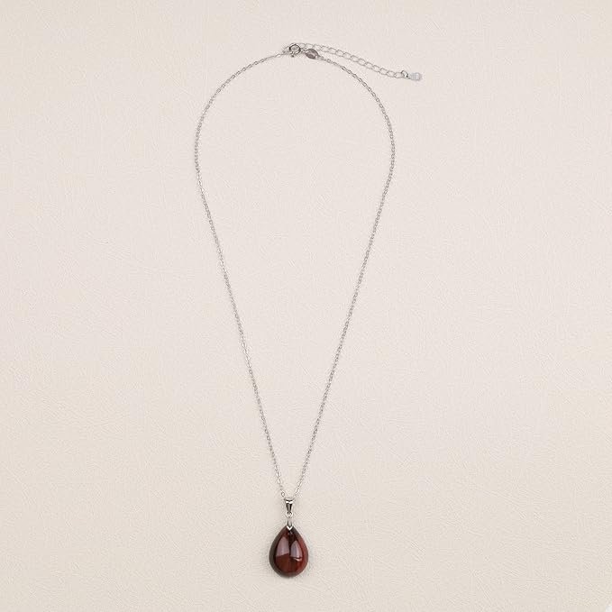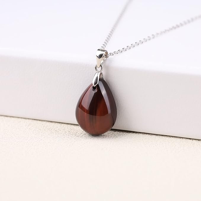 Elegante colgante de ojo de tigre rojo natural tallado en forma de gota. Montado en una cadena de Plata de Ley 925 chapada en rodio, esta joya destaca por sus reflejos rojizos únicos y su alta calidad.